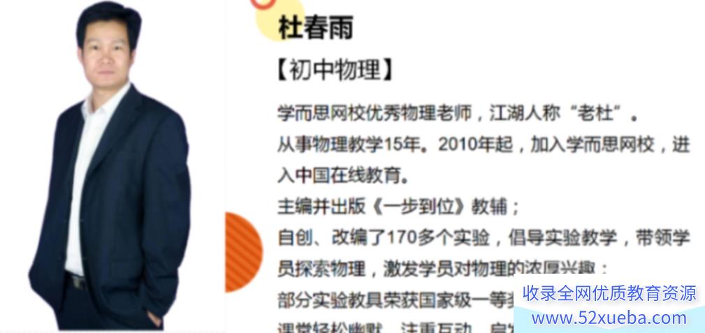 杜春雨,男,学而思网校初中物理教师。2010年成为学而思网校优秀教师,并主编出版《一步到位》教辅。